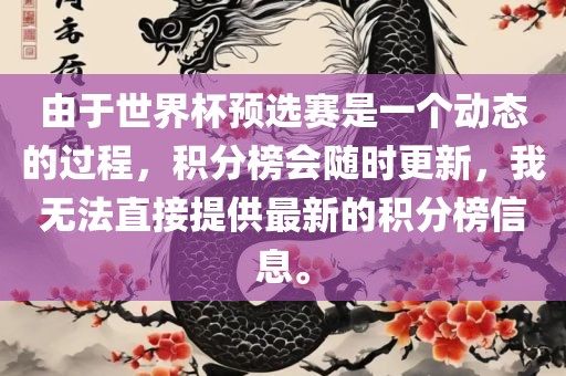 由于世界杯预选赛是一个动态的过程,积分榜会随时更新,我无法直接提供最新的积分榜信息。