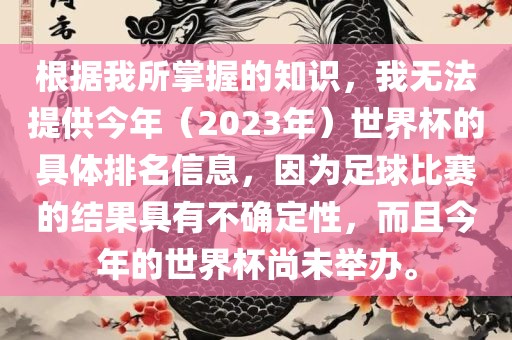 摘要:由于足球比赛的不可预测性和不确定性,无法提供关于今年(2023年)世界杯的具体排名信息。今年的世界杯尚未举办,因此无法确定各队的实力和表现。请继续关注相关赛事,以获取最新的比赛结果和排名信息。