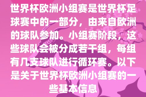世界杯欧洲小组赛是世界杯足球赛中的一部分,由来自欧洲的球队参加。小组赛阶段,这些球队会被分成若干组,每组有几支球队进行循环赛。以下是关于世界杯欧洲小组赛的一些基本信息