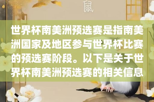 世界杯南美洲预选赛是指南美洲国家及地区参与世界杯比赛的预选赛阶段。以下是关于世界杯南美洲预选赛的相关信息