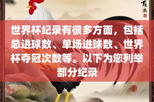 世界杯纪录有很多方面,包括总进球数、单场进球数、世界杯夺冠次数等。以下为您列举部分纪录