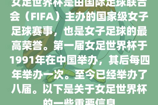 女足世界杯是由国际足球联合会(FIFA)主办的国家级女子足球赛事,也是女子足球的最高荣誉。第一届女足世界杯于1991年在中国举办,其后每四年举办一次。至今已经举办了八届。以下是关于女足世界杯的一些重要信息