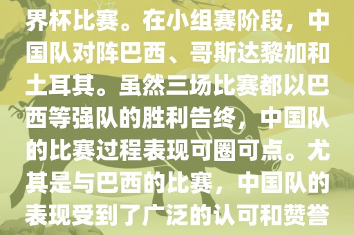 这是中国足球队历史上的一个重要里程碑,标志着中国足球在国际舞台上的崛起,虽然未能取得胜利,但这场比赛的经验和教训对于后续中国足球的发展至关重要,此后,中国足球一直在努力提高自己的水平,参加各种国际比赛和活动,逐渐走向成熟和强大。
