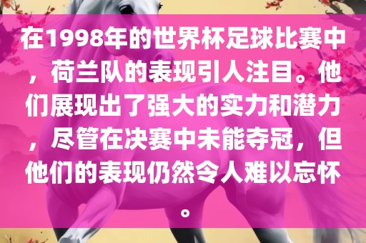 在1998年的世界杯足球比赛中,荷兰队的表现引人注目。他们展现出了强大的实力和潜力,尽管在决赛中未能夺冠,但他们的表现仍然令人难以忘怀。
