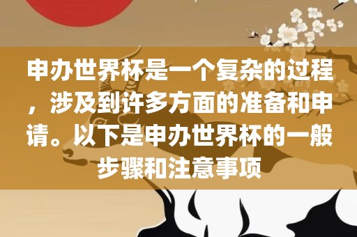 申办世界杯是一个复杂的过程,涉及到许多方面的准备和申请。以下是申办世界杯的一般步骤和注意事项