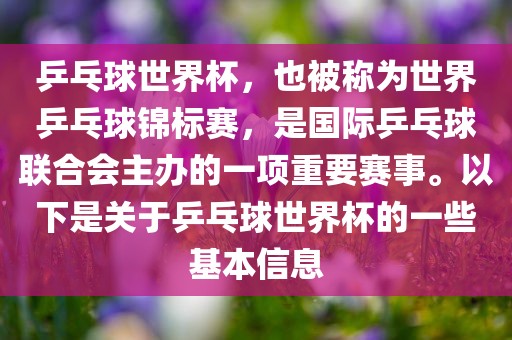 乒乓球世界杯,也被称为世界乒乓球锦标赛,是国际乒乓球联合会主办的一项重要赛事。以下是关于乒乓球世界杯的一些基本信息