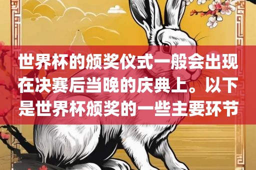 世界杯的颁奖仪式一般会出现在决赛后当晚的庆典上。以下是世界杯颁奖的一些主要环节