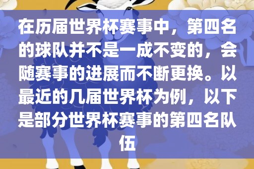 在历届世界杯赛事中,第四名的球队并不是一成不变的,会随赛事的进展而不断更换。以最近的几届世界杯为例,以下是部分世界杯赛事的第四名队伍