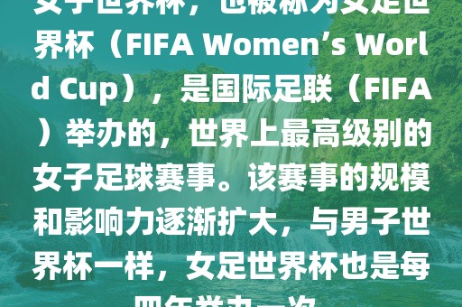 女子世界杯,也被称为女足世界杯(FIFA Women’s World Cup),是国际足联(FIFA)举办的,世界上最高级别的女子足球赛事。该赛事的规模和影响力逐渐扩大,与男子世界杯一样,女足世界杯也是每四年举办一次。