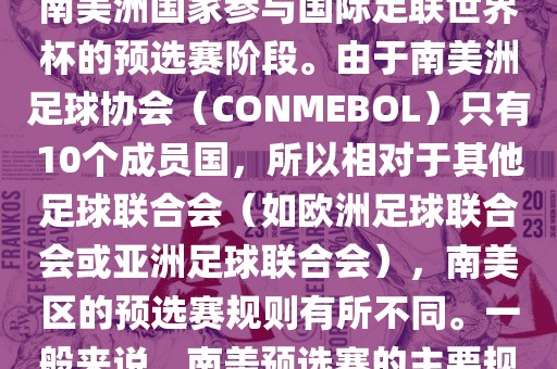 世界杯南美预选赛通常指的是南美洲国家参与国际足联世界杯的预选赛阶段。由于南美洲足球协会(CONMEBOL)只有10个成员国,所以相对于其他足球联合会(如欧洲足球联合会或亚洲足球联合会),南美区的预选赛规则有所不同。一般来说,南美预选赛的主要规则如下