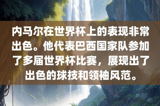 内马尔在世界杯上的表现令人瞩目,作为巴西国家队的重要球员,他多次参加世界杯比赛并展现出卓越的球技和领袖气质。他的表现成为了球队取得好成绩的关键之一。