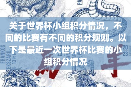 关于世界杯小组积分情况,不同的比赛有不同的积分规则。以下是最近一次世界杯比赛的小组积分情况